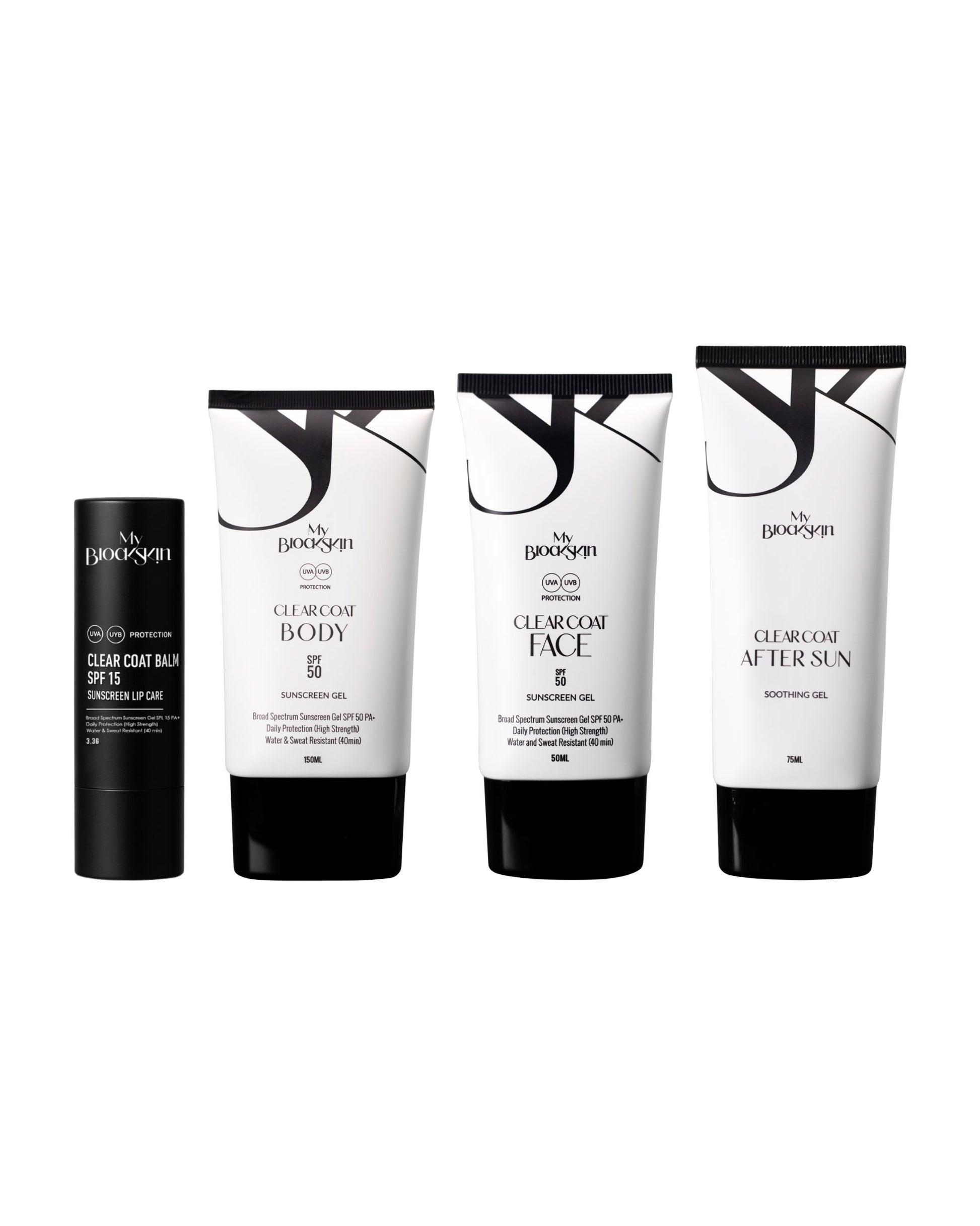 Clear, cast-free SPF care for every shade. A full routine—Face SPF 50, Body SPF 50, Lip Balm SPF 15, and cooling After Sun—for daily protection and post-sun comfort.